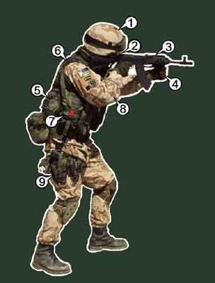 Taktické brýle s převkelem vz.95 a kevlarová přilba Mich 200 s povlakem vz.95 a páskou tzv. tygří oči.